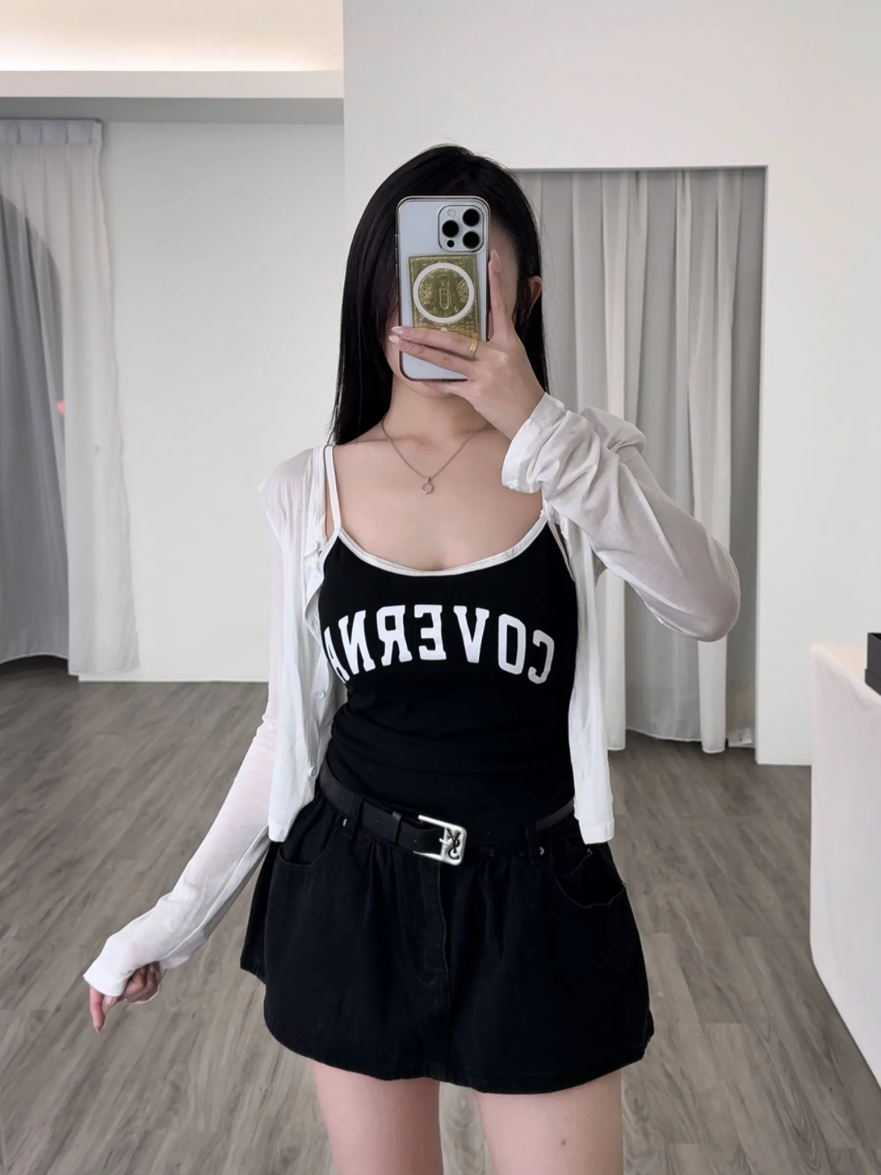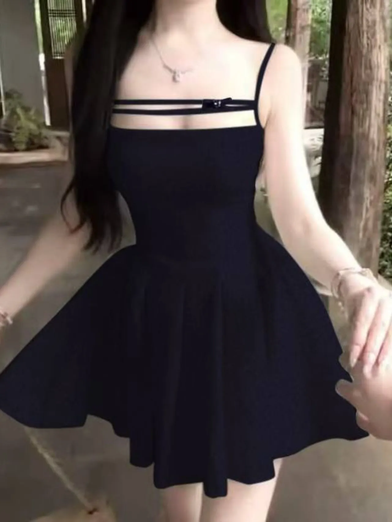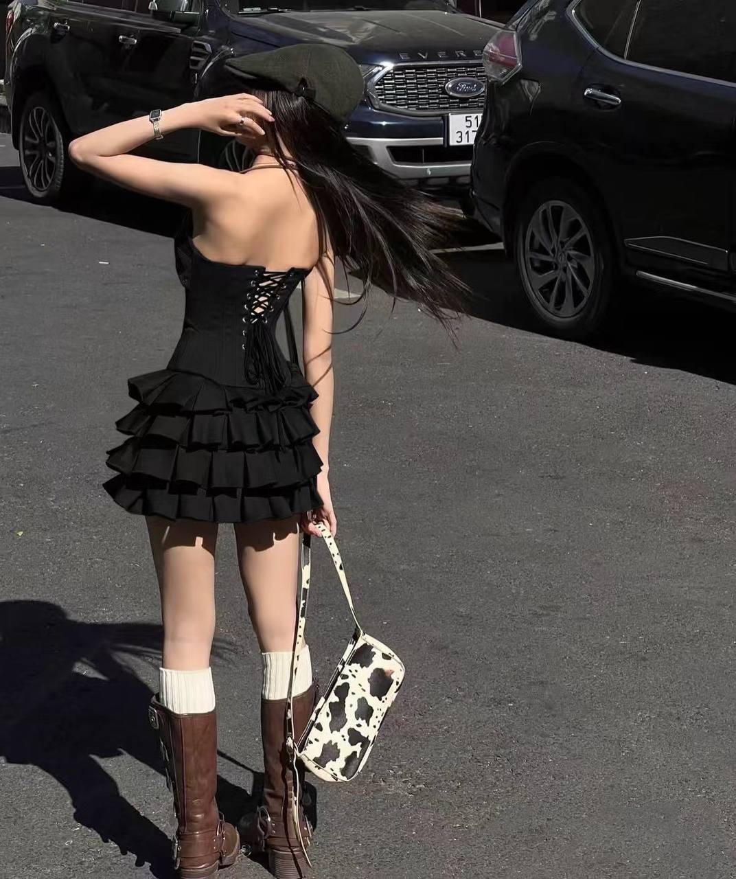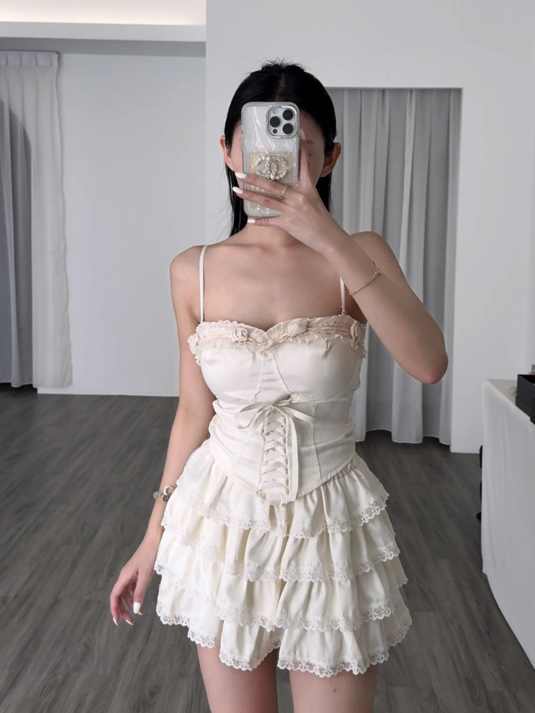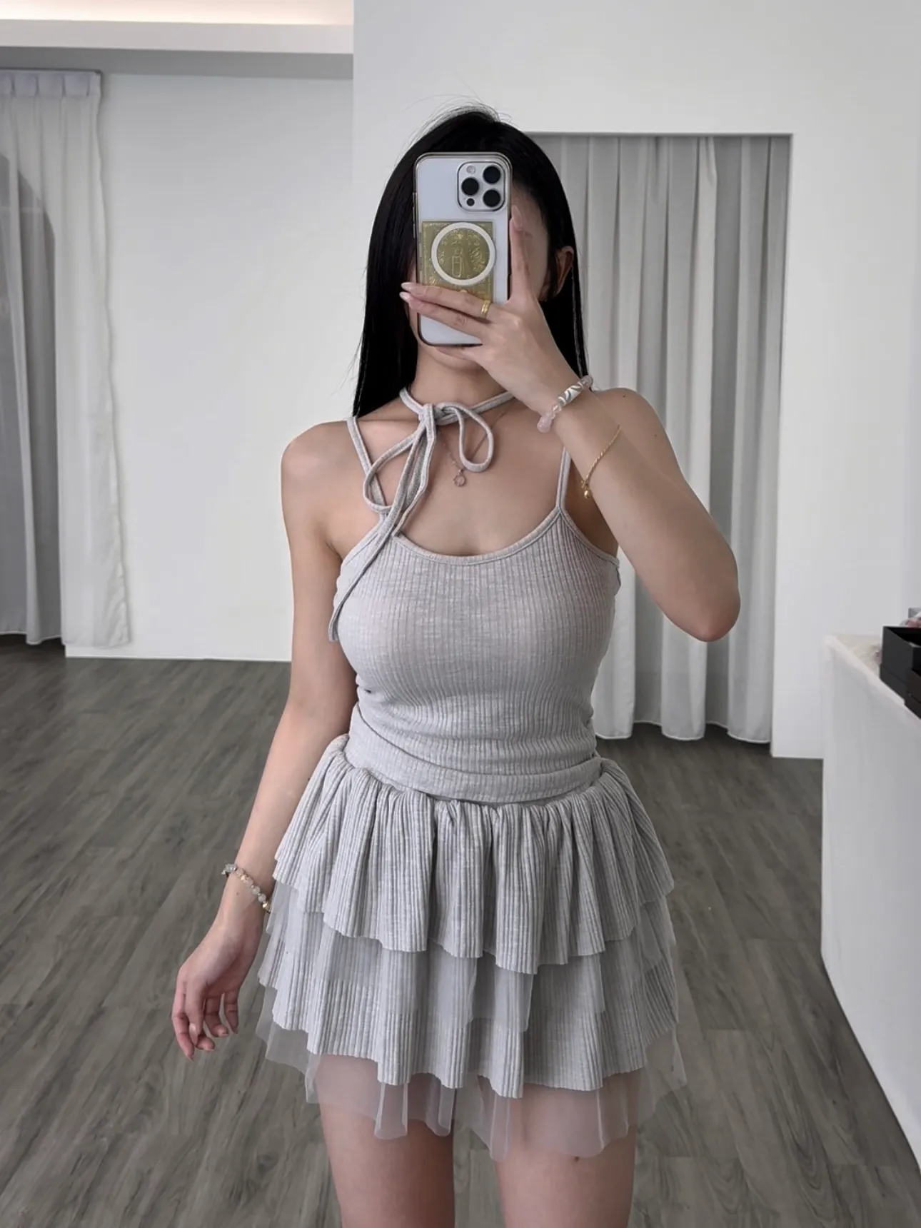 性感露锁骨吊带背心高腰蛋糕裙套装