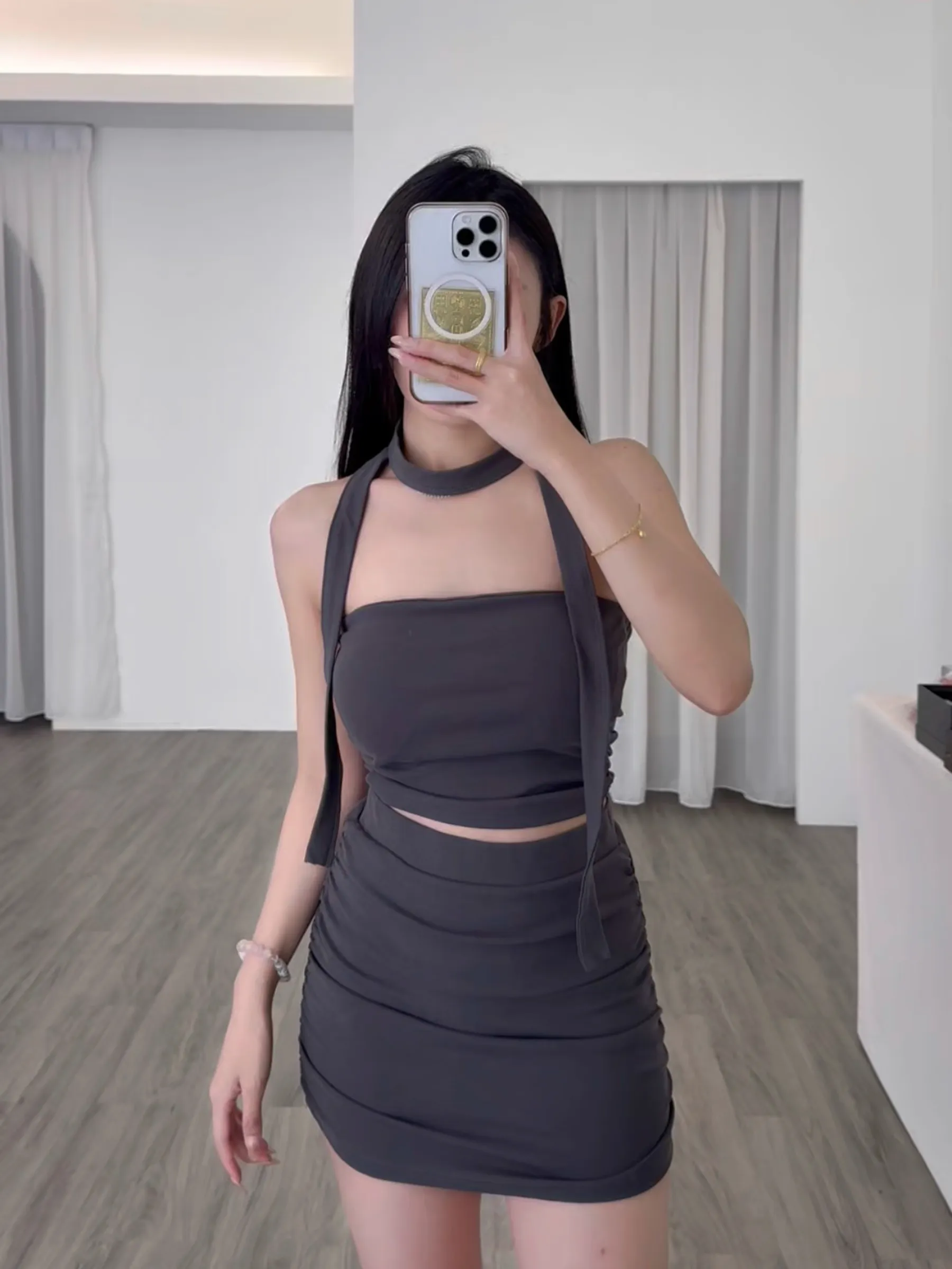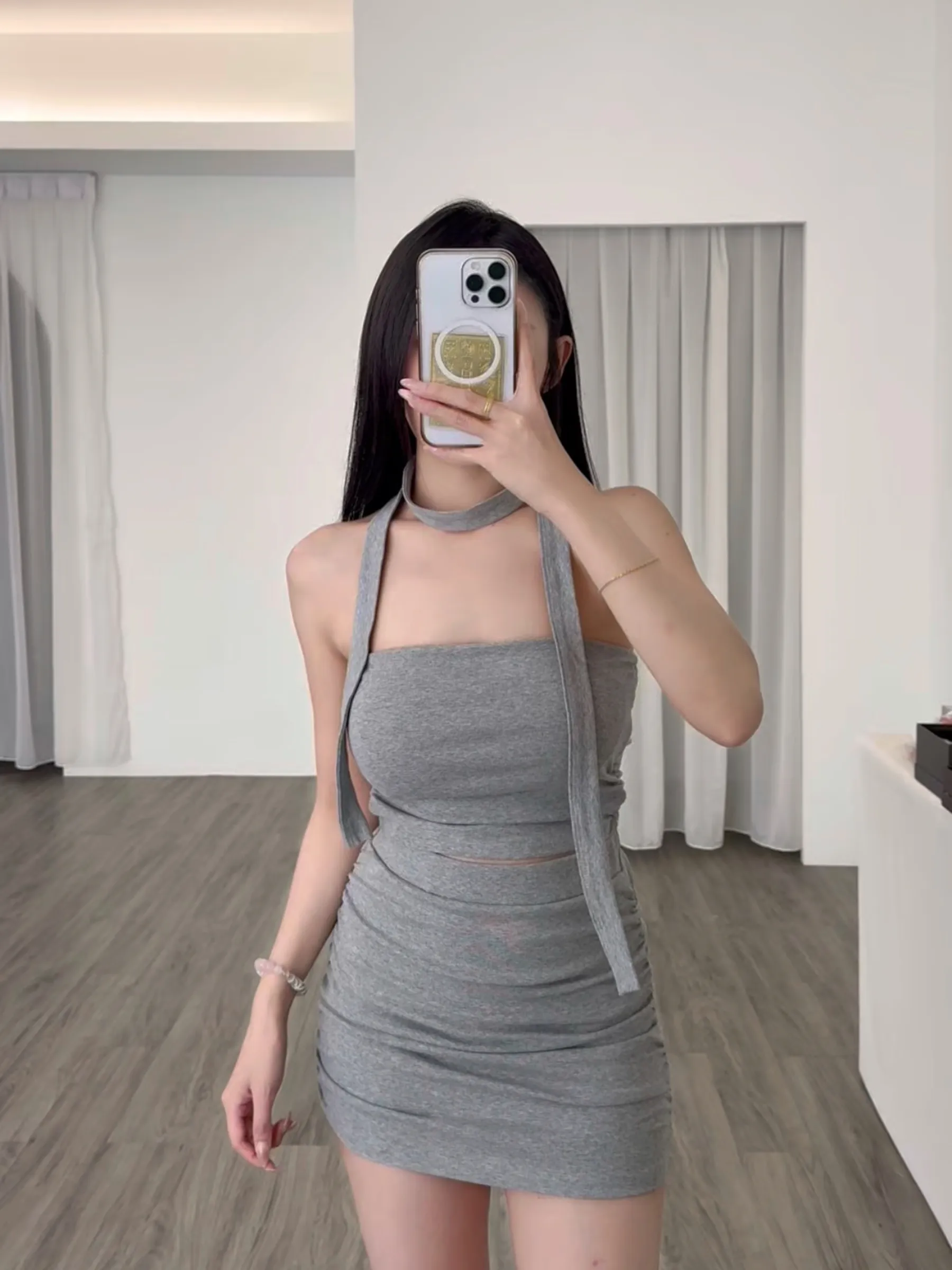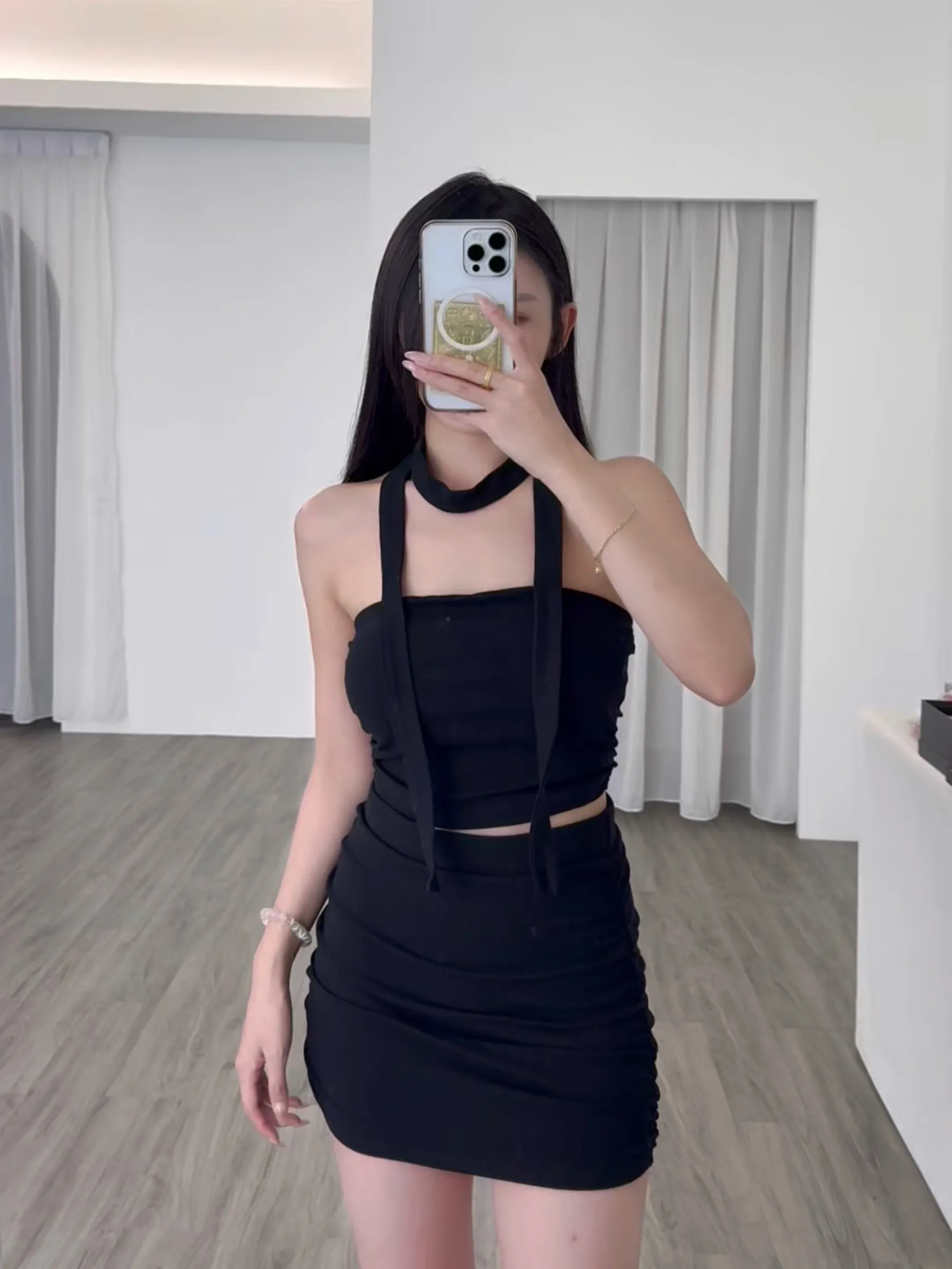 挂脖抹胸蓬蓬裙裤泡泡袖套装