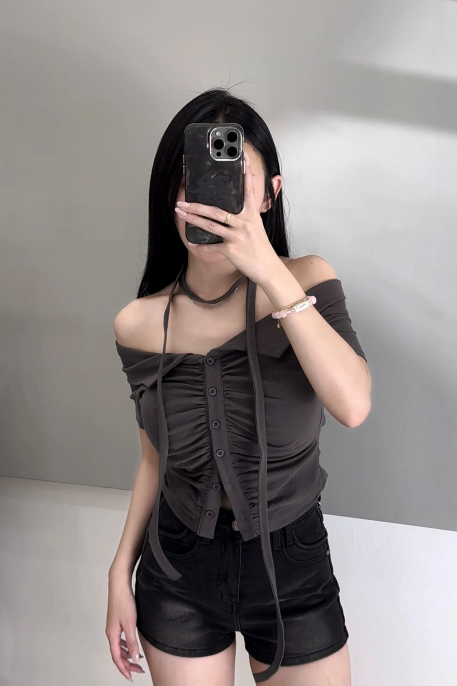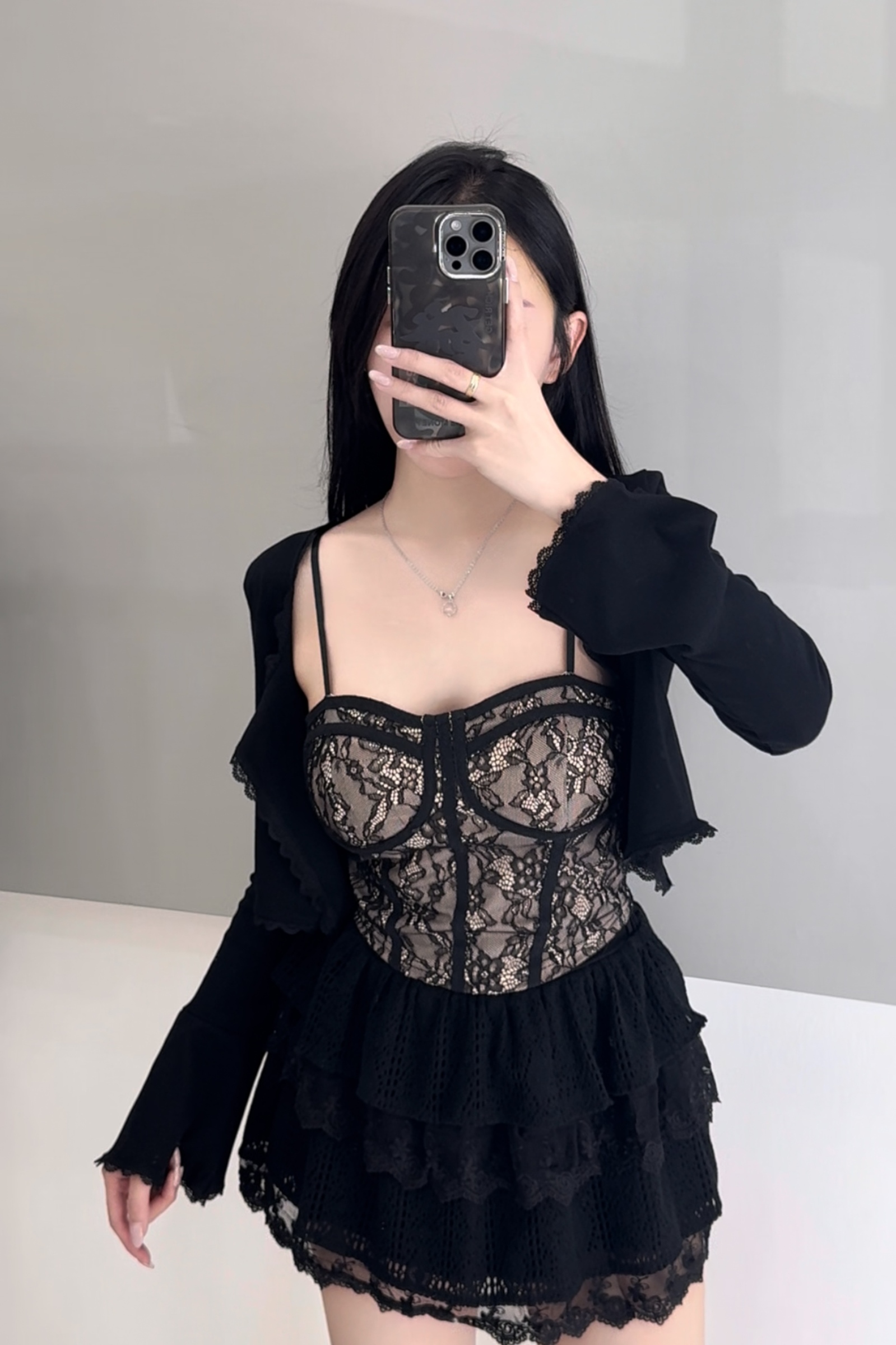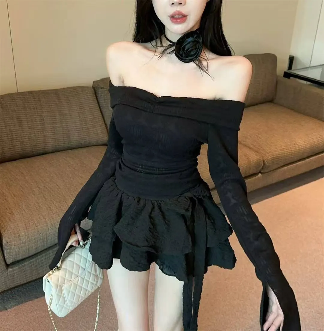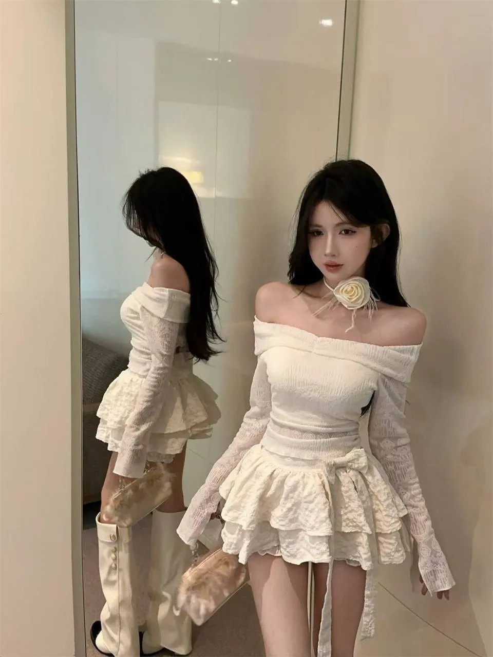 蕾丝一字肩上衣+蝴蝶蛋糕裙